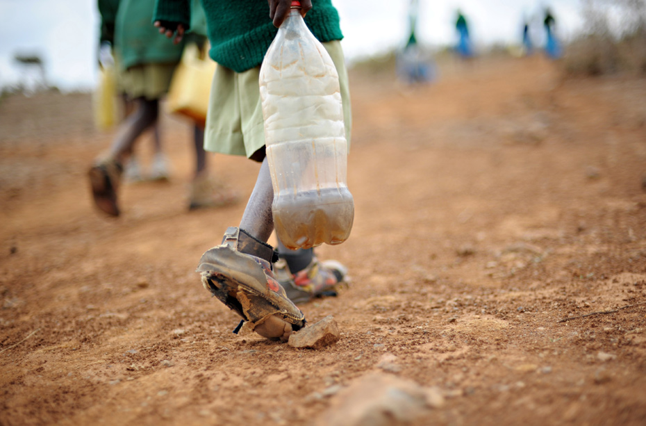 09年8月17,肯尼亞,一所學(xué)校的男孩穿著破舊鞋子,攜帶裝著河水的塑料瓶。