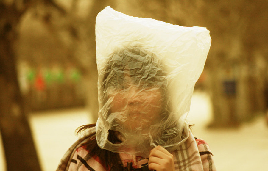 在濟南泉城路上,一名女孩頭戴塑料袋行走在街頭。鄭濤 攝