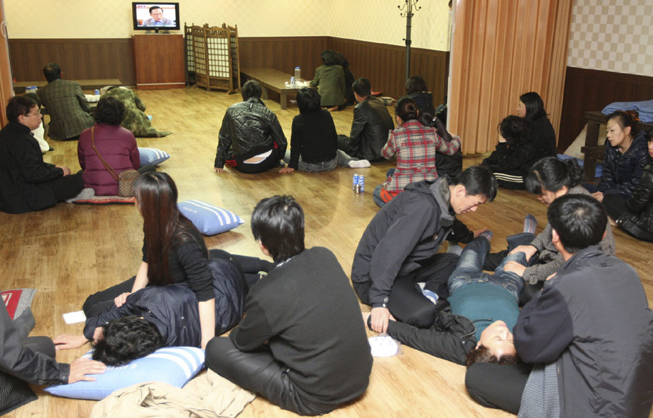 首爾當(dāng)?shù)貢r間26日晚9點(diǎn)45分許,在韓國西部海域執(zhí)行警戒任務(wù)的天安艦(1200噸級)因不明原因事故,船底被炸開洞,船尾開始下沉。天安艦上共有104人,韓國巡邏艇和直升飛機(jī)迅速展開救援行動,事發(fā)5小時后,官員稱已救出58人,但因?yàn)閺?qiáng)風(fēng)和夜幕,救援行動進(jìn)展緩慢,其它人員仍下落不明。圖為韓國海軍“天安艦”上士兵的家屬正圍在電視前等待消息。