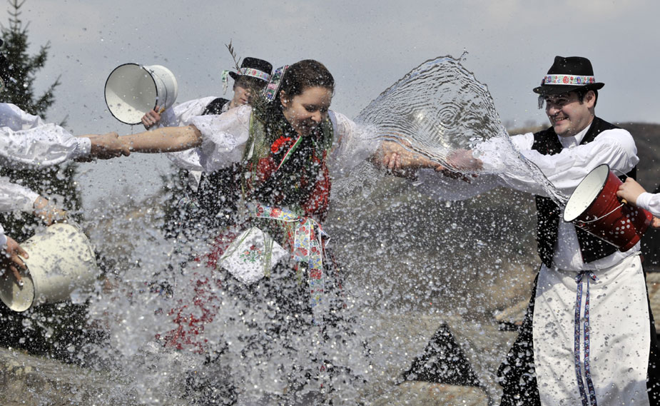 3月26日,在匈牙利首都布達佩斯以東被譽為世界文化遺產(chǎn)的霍洛克村,當?shù)鼐用褚韵蚬媚锷砩蠞娝膫鹘y(tǒng)儀式慶祝復(fù)活節(jié)。此項古老習俗起源于公元2世紀。