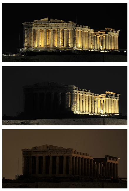 由世界自然基金會發(fā)起的“地球一小時”環(huán);顒27日20點30分按照時區(qū)依次在全球數(shù)千個城市展開。圖為希臘帕特農(nóng)神廟在熄燈前和熄燈后的景色。