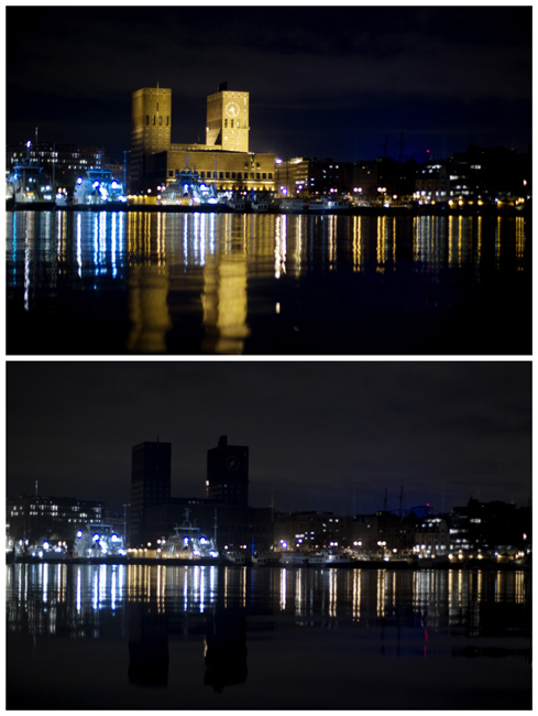 由世界自然基金會發(fā)起的“地球一小時”環(huán)保活動27日20點30分按照時區(qū)依次在全球數(shù)千個城市展開。圖為挪威奧斯陸市政廳在熄燈前和熄燈后的景色。