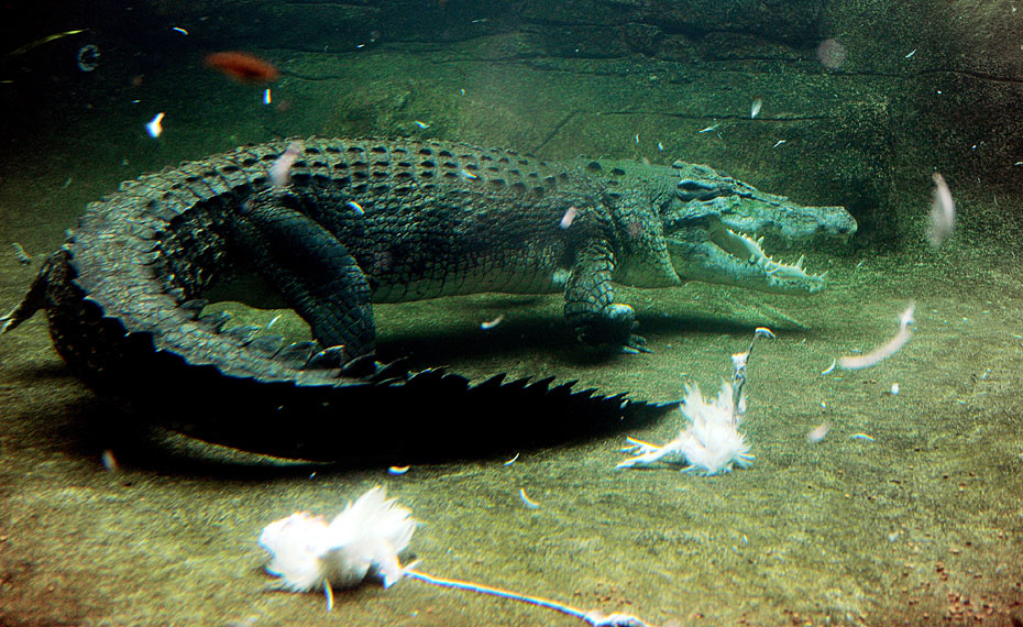 3月29日,澳大利亞悉尼野生動物園的一條鱷魚雷克斯正在享受它的美味——雞肉。圖片來源:中國新聞網