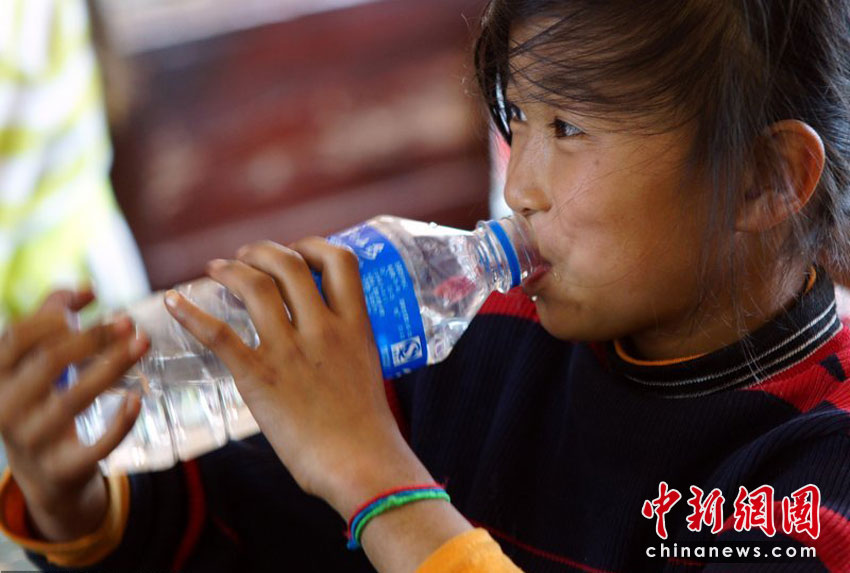 上課時,孩子們喝在桌子上放著的礦泉水,現在他們每天發(fā)兩瓶水,很多孩子省下來一半帶回家給家人。沙浪 攝