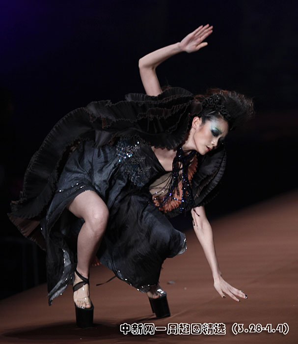3月29日晚,旭化成·中國時裝設(shè)計(jì)師創(chuàng)意大獎張義超作品發(fā)布會在北京舉行,一名模特在T型臺上“失足”摔倒。圖片來源:中國新聞網(wǎng)>>點(diǎn)擊觀看詳細(xì)內(nèi)容