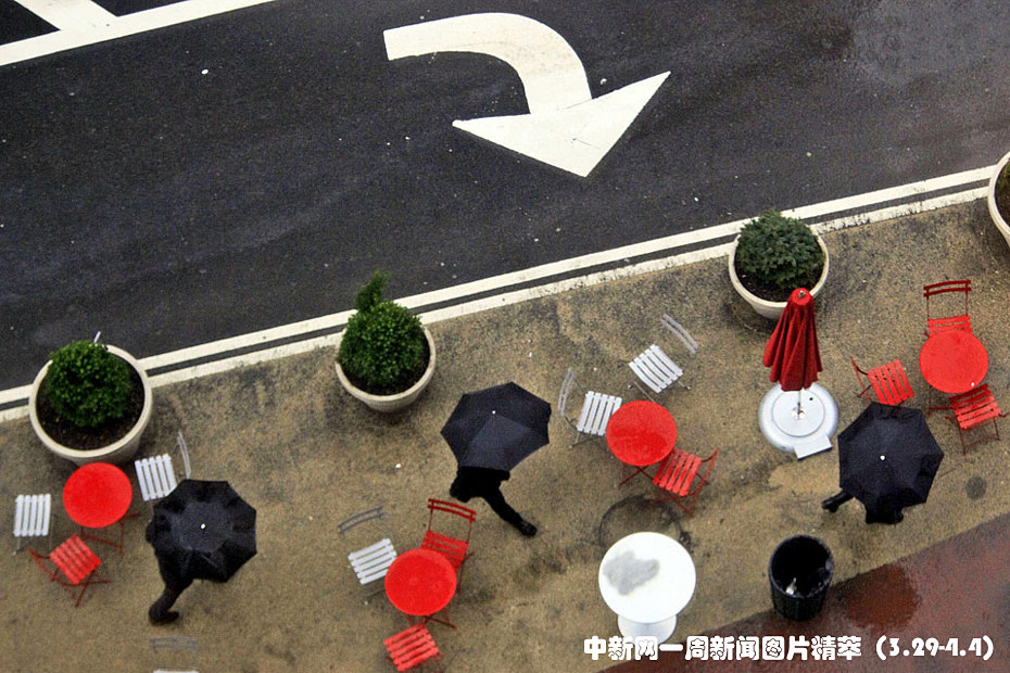 周一(29日),行人在雨中穿過紐約時(shí)代廣場(chǎng)。早前一場(chǎng)暴風(fēng)雨席卷了美國(guó)東北部。