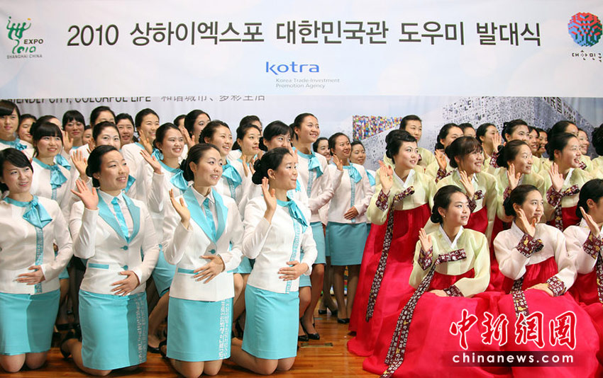 2010年4月5日,負(fù)責(zé)上海世博會(huì)韓國(guó)館宣傳和介紹的服務(wù)人員90人當(dāng)日在首爾舉行了組團(tuán)儀式。