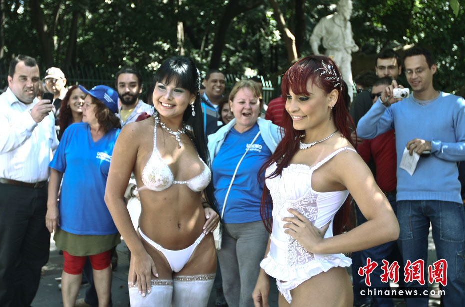 4月8日,巴西模特身著內衣在圣保羅大街走秀,宣傳第16屆巴西情趣用品博覽會。圖片來源:中國新聞網