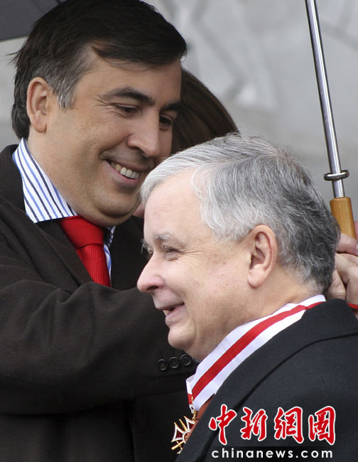 波蘭總統(tǒng)卡欽斯基乘坐的一架圖-154飛機10日在俄羅斯斯摩棱斯克州北部一軍用機場降落時失事,至少87人死亡?J斯基本人被確認身亡。圖為2007年波蘭總統(tǒng)卡欽斯基與格魯吉亞總統(tǒng)米哈伊爾薩卡什維利。
