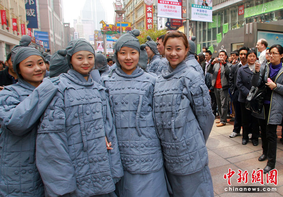 4月10日,由西安旅游局承辦的兵馬俑牽手上海世博會大型旅游宣傳咨詢活動舉行。來自兵馬俑故鄉(xiāng)的百人表演隊伍,身著灰色的兵馬俑服裝,以鏗鏘的節(jié)奏、雄壯的氣勢,在上海南京東路步行街和東方明珠廣場游演,吸引了大批市民及海內(nèi)外游客駐足觀看。朱良城/CFP