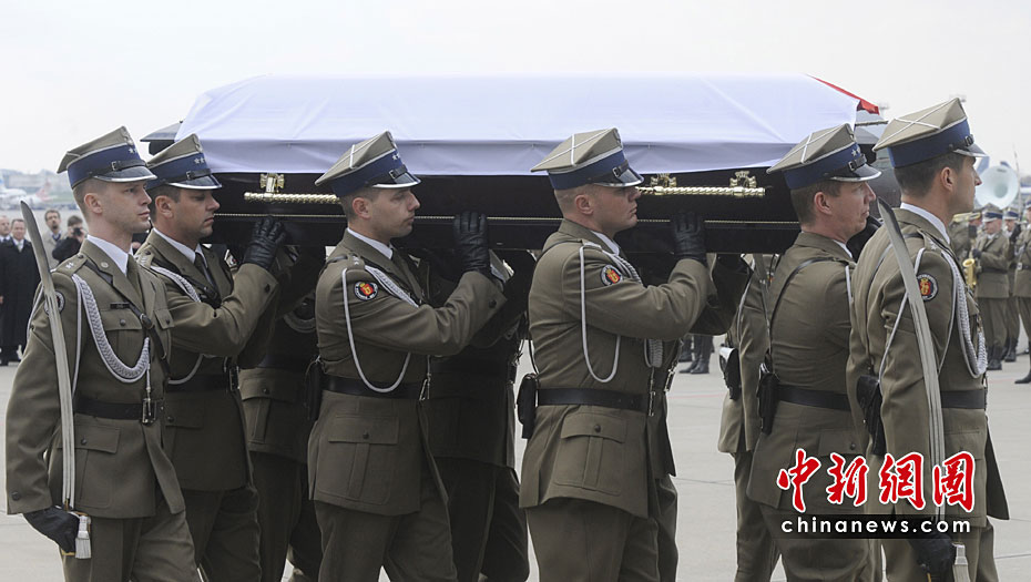 4月10日,卡欽斯基乘坐專機從華沙飛往俄羅斯斯摩棱斯克市,參加卡廷森林事件70周年紀念活動。途中飛機在斯摩棱斯克“北方”軍用機場附近降落時失事,共造成包括卡欽斯基夫婦及眾多政府高官在內(nèi)的96人死亡。慘劇發(fā)生后,舉世震驚。圖為禮兵將卡欽斯基的遺體抬上靈車。