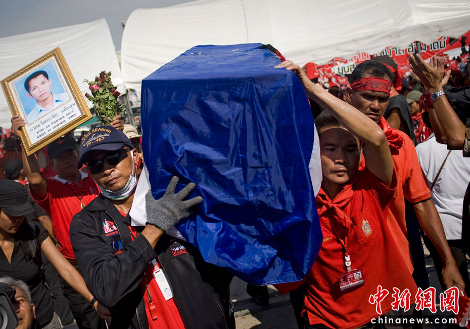 當(dāng)?shù)貢r(shí)間4月12日,泰國(guó)紅衫軍在曼谷市區(qū)抬著棺材舉行游行,借此向政府施壓促阿披實(shí)下臺(tái)。此前紅衫軍示威者與軍警發(fā)生沖突,造成21人死亡。圖片來(lái)源:中國(guó)新聞網(wǎng)