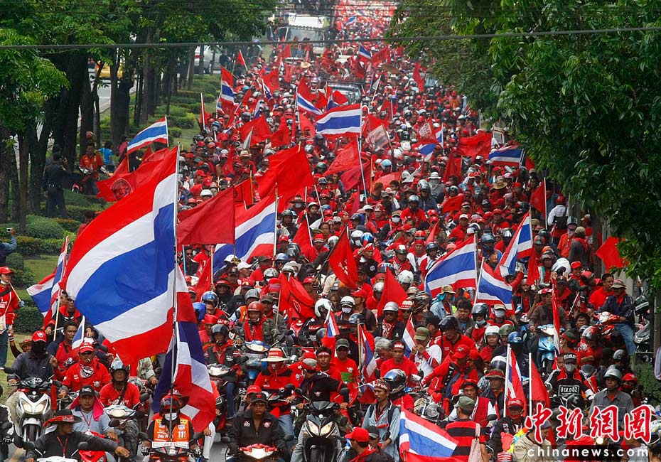 當(dāng)?shù)貢r(shí)間4月12日,泰國(guó)紅衫軍在曼谷市區(qū)抬著棺材舉行游行,借此向政府施壓促阿披實(shí)下臺(tái)。此前紅衫軍示威者與軍警發(fā)生沖突,造成21人死亡。圖片來(lái)源:中國(guó)新聞網(wǎng)
