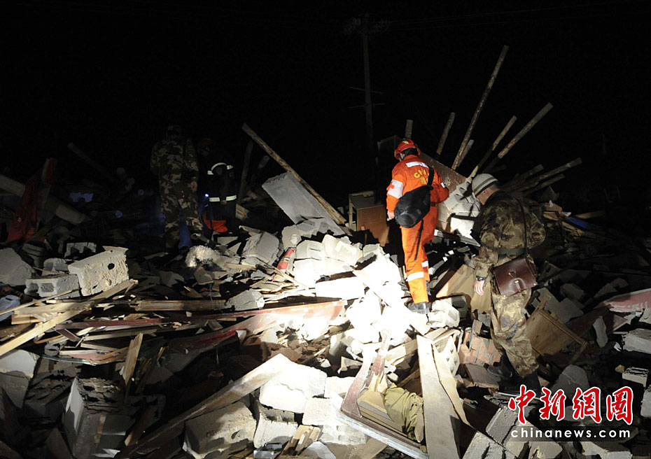 圖為4月15日凌晨1時(shí),武警玉樹(shù)州支隊(duì)?wèi)?zhàn)士和中國(guó)國(guó)際救援隊(duì)隊(duì)員一起搜救被困民眾。中新社發(fā) 廖攀 攝