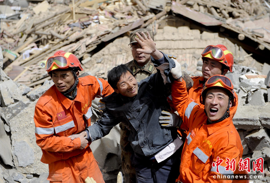 圖為4月15日12時,一位幸存者被中國國際地震救援隊在青海玉樹縣結古鎮(zhèn)西北牛賓館廢墟中救出,他微笑著揮動手臂。中新社發(fā) 廖攀 攝