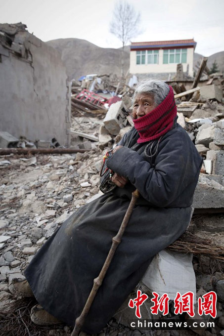 圖為4月15日,青海玉樹,新建路,84歲的老奶奶卓瑪坐在家門口,她說(shuō)她46歲的女兒已經(jīng)在地震中遇難了。(CFP 圖)