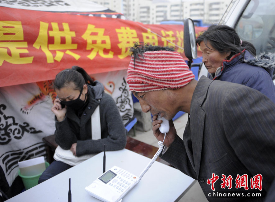 4月16日,青海玉樹體育場地震受災(zāi)民眾安置點,民眾撥打有關(guān)部門安裝的免費電話報平安。 中新社發(fā) 廖攀 攝