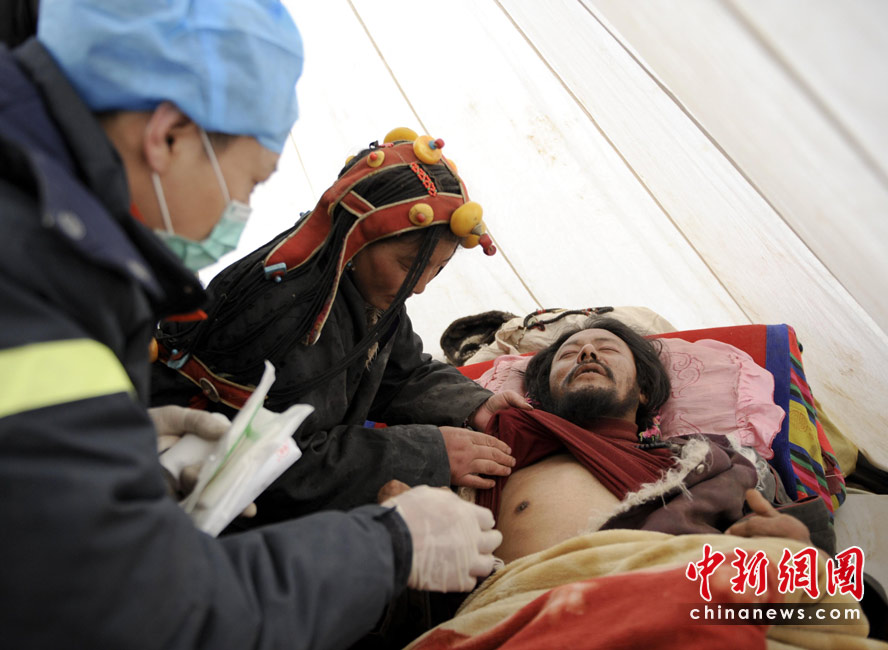4月16日,青海玉樹體育場地震災(zāi)民安置點,武警醫(yī)院醫(yī)療隊醫(yī)務(wù)人員來到東周丹增家的帳篷里為傷者檢查身體。中新社發(fā) 廖攀 攝