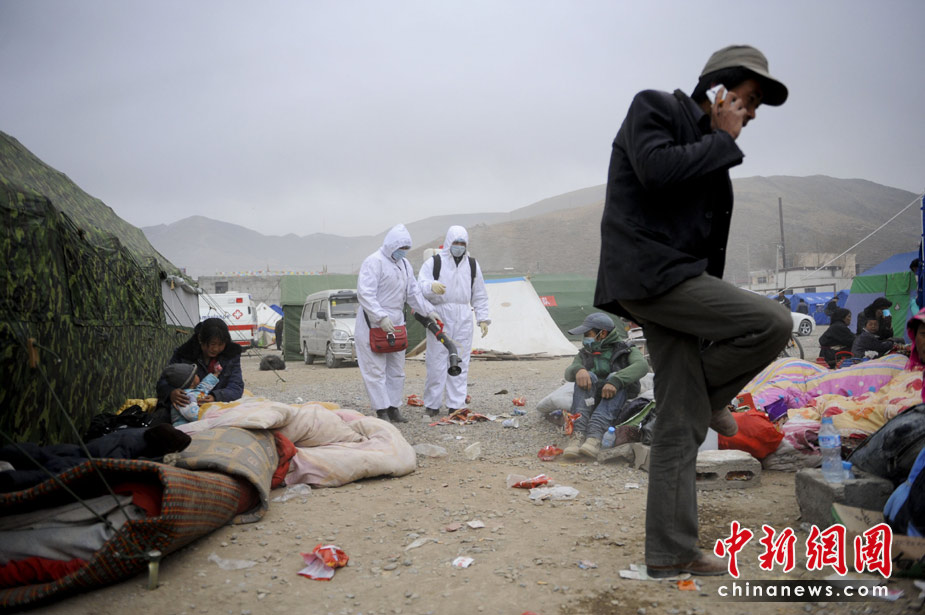4月16日,青海玉樹體育場(chǎng)地震災(zāi)民安置點(diǎn),青海疾控中心展開防疫消毒工作。中新社發(fā) 廖攀 攝