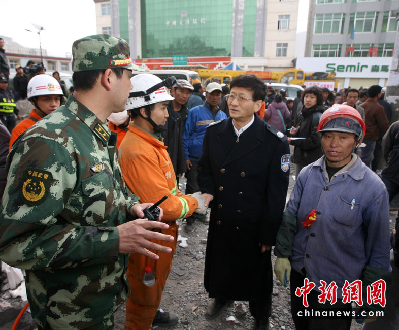 2010年4月16日10時許,國務委員、公安部部長孟建柱來到青海省玉樹藏族自治州玉樹縣地震災區(qū)四川消防部隊玉樹教育局救援現(xiàn)場,詢問救援情況,并看望慰問消防官兵。4月14日07時49分許,青海省玉樹藏族自治州玉樹縣(北緯33.1,東經96.7)發(fā)生7.1級地震。中新社發(fā) 劉忠俊 攝