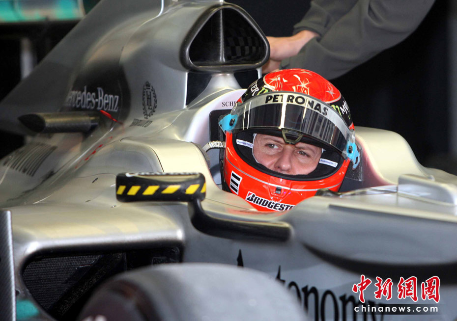 4月16日,2010國(guó)際汽聯(lián)F1世界錦標(biāo)賽上海站在上海國(guó)際賽車場(chǎng)開始車手第一、第二次練習(xí)賽。圖為代表梅賽德斯GP車隊(duì)出戰(zhàn)的老車王、德國(guó)車手舒馬赫重回上海賽道。 中新社記者 任晨鳴 攝