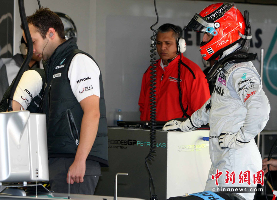 4月16日,2010國際汽聯(lián)F1世界錦標(biāo)賽上海站在上海國際賽車場(chǎng)開始車手第一、第二次練習(xí)賽。圖為代表梅賽德斯GP車隊(duì)出戰(zhàn)的老車王、德國車手舒馬赫重回上海賽道。 中新社記者 任晨鳴 攝