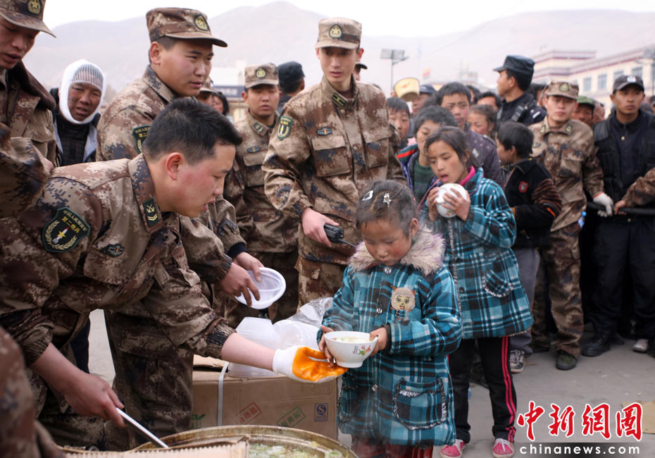 4月16日,青海省玉樹藏族自治州玉樹縣地震發(fā)生第三天,為確保災民有飯吃、有帳篷住,玉樹城內(nèi)各個安置點架起鍋灶為受災民眾分發(fā)免費食物并幫助搭建帳篷。4月14日07時49分許,青海省玉樹藏族自治州玉樹縣(北緯33.1,東經(jīng)96.7)發(fā)生7.1級地震。中新社發(fā) 劉忠俊 攝