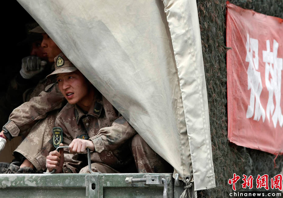 2010年4月16日,青海玉樹藏族自治州玉樹縣結古鎮(zhèn),剛剛抵達的三名解放軍準備投入現場救援。中新社發(fā) 盛佳鵬 攝