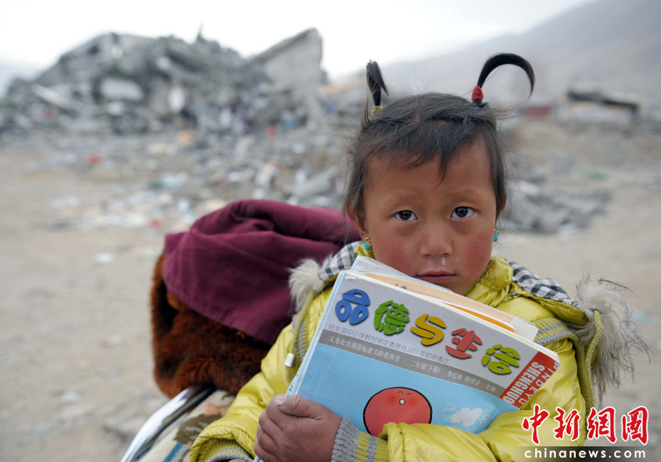 4月17日,一位上小學(xué)二年級(jí)的女童緊抱著自己的課本,站在震后的廢墟前。4月17日上午,青海省民政廳廳長(zhǎng)更陽(yáng)向媒體發(fā)布了一系列安撫救濟(jì)措施,災(zāi)民生活補(bǔ)助按每人每天15元,每一個(gè)死亡人員家庭補(bǔ)助8000元,“三孤”指孤老、孤殘、孤兒補(bǔ)助每人每月1000元,孤兒補(bǔ)助到18歲止。中新社發(fā) 陳文 攝