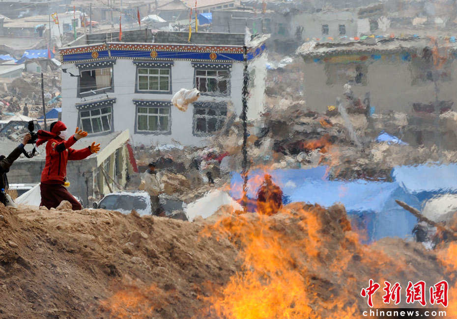 4月17日,青海省玉樹縣結(jié)古鎮(zhèn)附近的山坡上,眾多地震遇難者遺體被火葬。當(dāng)日,為妥善及時(shí)處理遇難人員遺體,預(yù)防災(zāi)區(qū)疫情的發(fā)生與流行,青海出臺(tái)地震遇難人員遺體處理意見,強(qiáng)調(diào)在處理遺體時(shí)要尊重少數(shù)民族喪葬習(xí)俗,尊重死者尊嚴(yán)。圖為眾多僧侶為逝者祈禱。中新社發(fā) 廖攀 攝