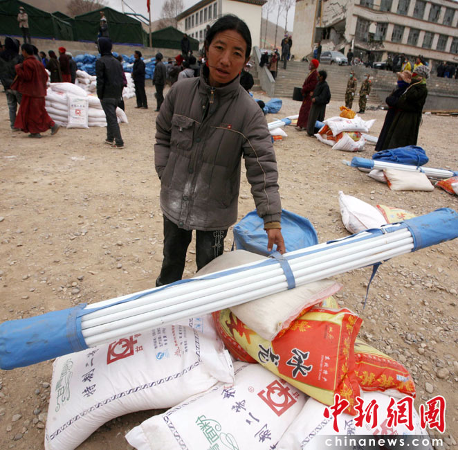 4月17日,大批救災(zāi)物資抵達青海省玉樹地震災(zāi)區(qū),當(dāng)?shù)卣皶r組織將救災(zāi)帳篷和糧食分發(fā)到災(zāi)民手中。圖為玉樹清水河鄉(xiāng)的受災(zāi)民眾領(lǐng)到全家的救災(zāi)物資糧食和帳篷。中新社發(fā) 劉忠俊 攝