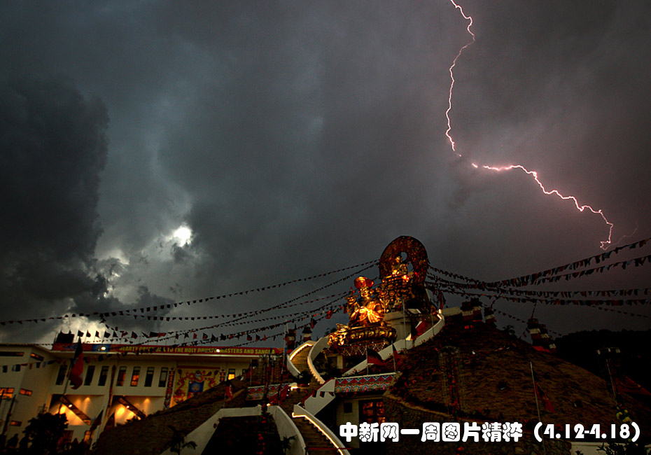 4月14日周三在尼泊爾加德滿都郊區(qū),一座舍利塔附近電閃雷鳴,這座佛塔內(nèi)供奉著佛祖舍利。