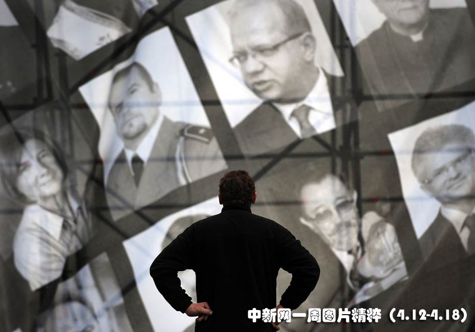 一個人在波蘭空難受害者遺像前默哀。