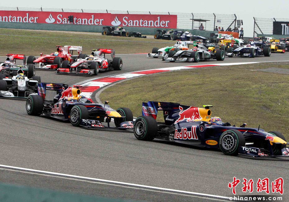 4月18日下午,2010國(guó)際汽聯(lián)F1世界錦標(biāo)賽上海站在上海國(guó)際賽車場(chǎng)舉行正式比賽,邁凱輪車隊(duì)的英國(guó)車手巴頓在雨中獲得冠軍、隊(duì)友、英國(guó)車手漢密爾頓獲得亞軍,梅賽德斯GP車隊(duì)的德國(guó)車手羅斯伯格獲得季軍。圖為比賽發(fā)車后眾位車手通過一號(hào)彎。中新社記者 任晨鳴 攝
