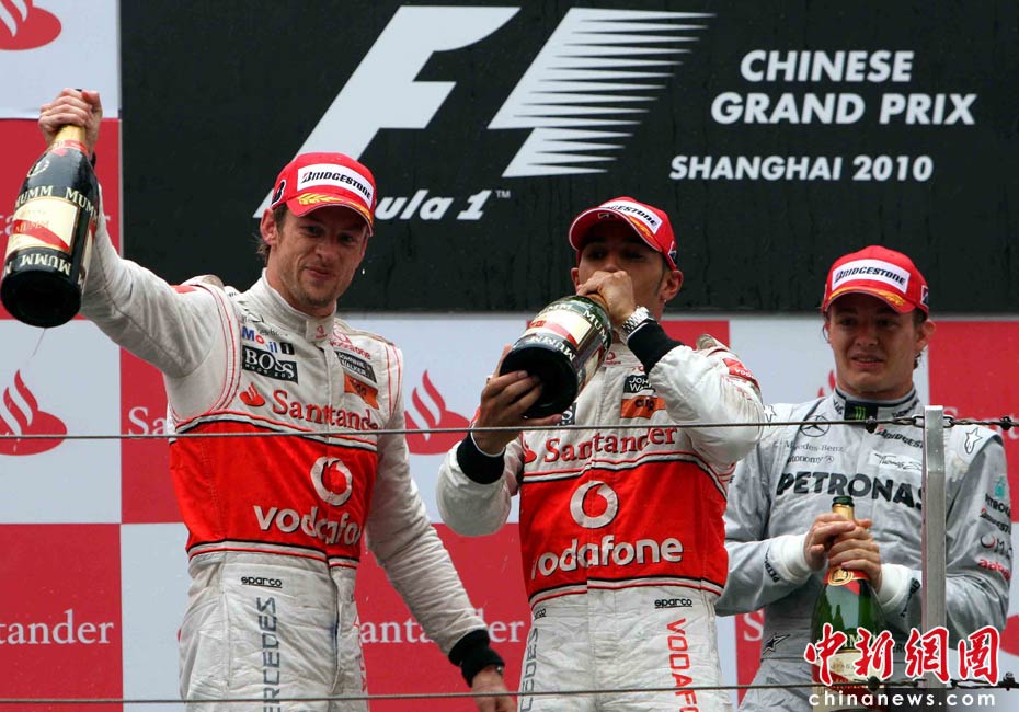 4月18日下午,2010國(guó)際汽聯(lián)F1世界錦標(biāo)賽上海站在上海國(guó)際賽車場(chǎng)舉行正式比賽,邁凱輪車隊(duì)的英國(guó)車手巴頓(左)在雨中獲得冠軍、隊(duì)友、英國(guó)車手漢密爾頓(中)獲得亞軍,梅賽德斯GP車隊(duì)的德國(guó)車手羅斯伯格獲得季軍。中新社記者 任晨鳴 攝