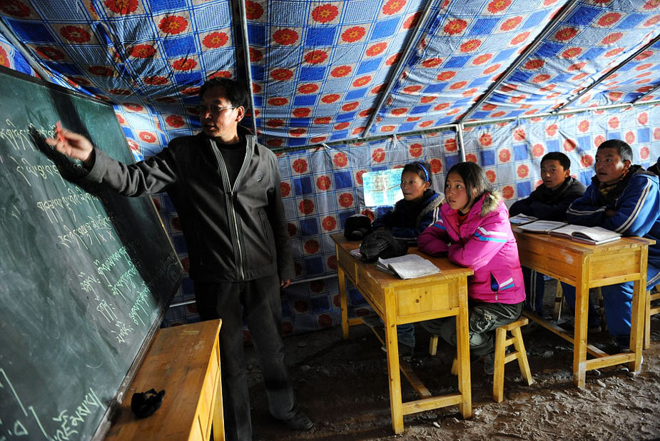 4月18日,70多名孩子在地震四天后重新走進了課堂,玉樹州孤兒學(xué)校成為了地震災(zāi)區(qū)第一所復(fù)課的學(xué)校,剛完成帳篷搭建的青海省玉樹藏族自治州第一民族中學(xué)3個年級的學(xué)生也開始復(fù)課。圖為4月18日,玉樹藏族自治州第一民族中學(xué)八年級老師次成尼瑪(左一)在帳篷教室內(nèi)給學(xué)生上課。 圖片來源:新華網(wǎng)