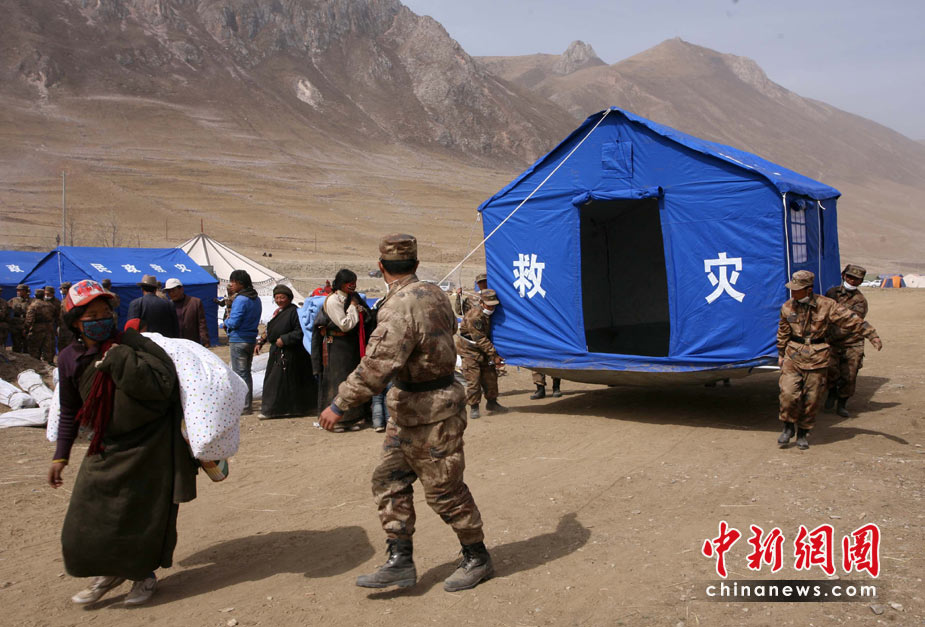 4月18日,青海玉樹囊謙縣扎西科跑馬場災(zāi)民安置區(qū)內(nèi),來自甘肅的救援部隊為災(zāi)民搭建120頂新帳篷,讓在地震中失去家園的災(zāi)民及時住上帳篷“新”家。中新社發(fā) 劉忠俊 攝