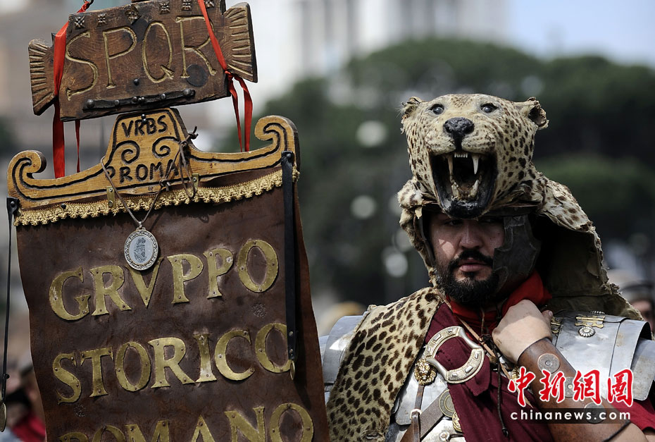 4月18日,意大利羅馬,男子打扮成武士在圓形競(jìng)技場(chǎng)附近參加游行,慶祝羅馬建城2763周年。圖片來源:中國(guó)新聞網(wǎng)