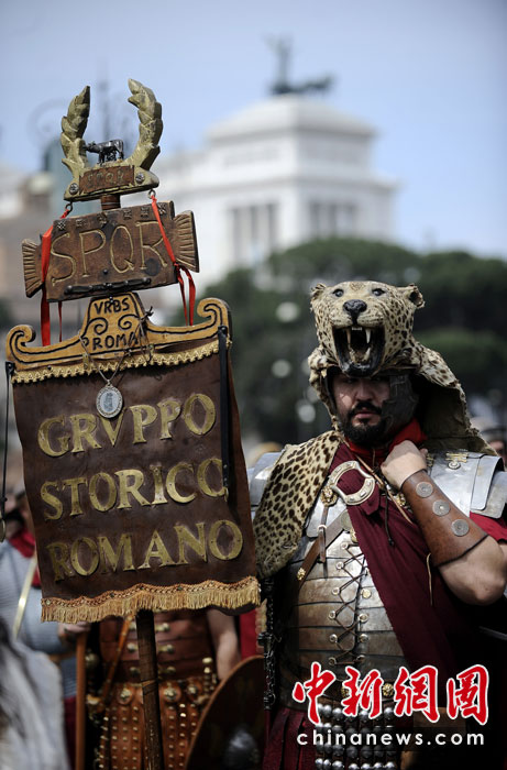4月18日,意大利羅馬,男子打扮成武士在圓形競(jìng)技場(chǎng)附近參加游行,慶祝羅馬建城2763周年。圖片來(lái)源:中國(guó)新聞網(wǎng)