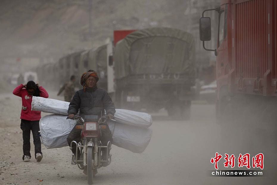 2010年4月19日,青海省玉樹縣結(jié)古鎮(zhèn),一位領(lǐng)取救災(zāi)物品的民眾騎著摩托車行走在塵土中。眾多的救援車輛在道路上行走以及大風(fēng)天氣,結(jié)古鎮(zhèn)的道路經(jīng)常塵土彌漫。中新社發(fā) 盛佳鵬 攝