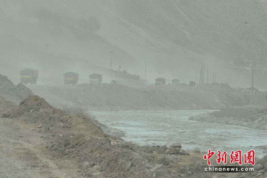 4月中旬青海玉樹(shù)地震災(zāi)區(qū)風(fēng)沙迷漫,中國(guó)各地軍民車隊(duì)在風(fēng)塵滾滾中馳援青藏高原偏僻一角的玉樹(shù),艱難開(kāi)通抗震救災(zāi)大通道。中新社發(fā) 賈國(guó)榮 攝