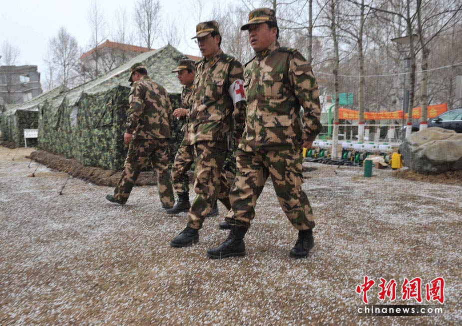 4月20日12時許,玉樹地震災(zāi)區(qū)突然雷雹交加,青海武警總隊醫(yī)療救護(hù)隊帳篷前一片雪白,軍醫(yī)立刻商量救護(hù)對策。中新社發(fā) 賈國榮 攝