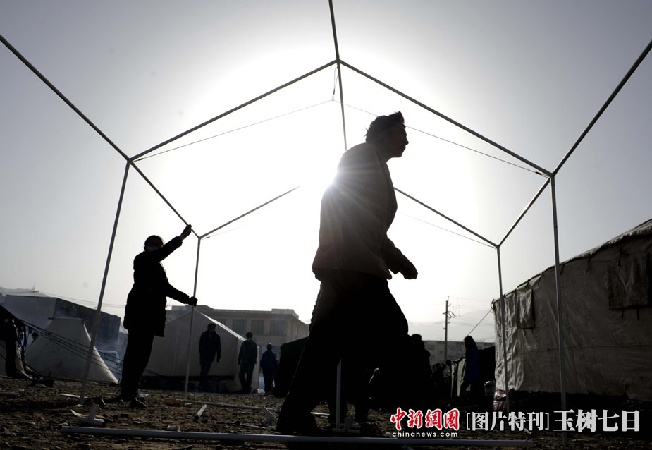 青海玉樹縣體育場的地震災民安置點內(nèi),玉樹地震災民正在積極自建抗震帳棚。中新社發(fā) 廖攀 攝