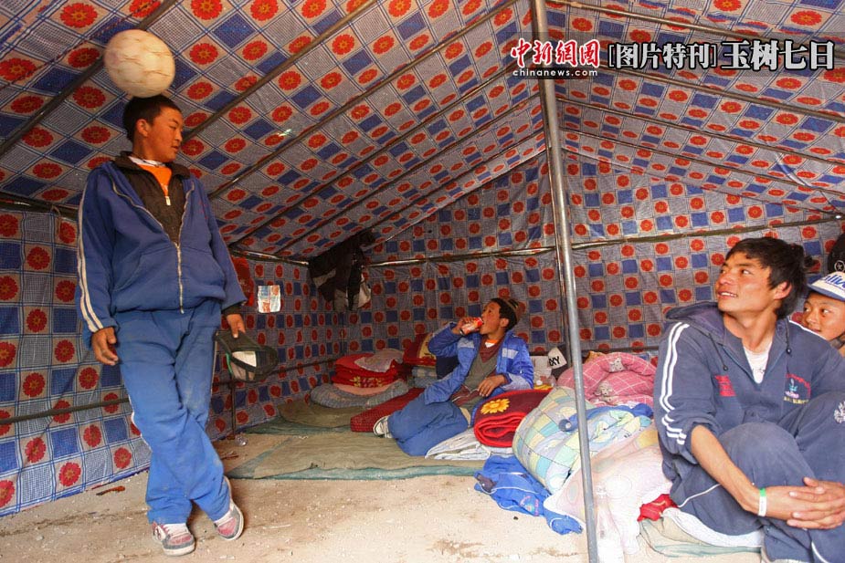 2010年4月19日,青海玉樹縣結(jié)古鎮(zhèn)玉樹縣第一民族中學(xué)的學(xué)生宿舍帳篷內(nèi),德尕扎西(左)在其他同學(xué)面前表演球技,稱自己是“C羅”。中新社發(fā) 盛佳鵬 攝