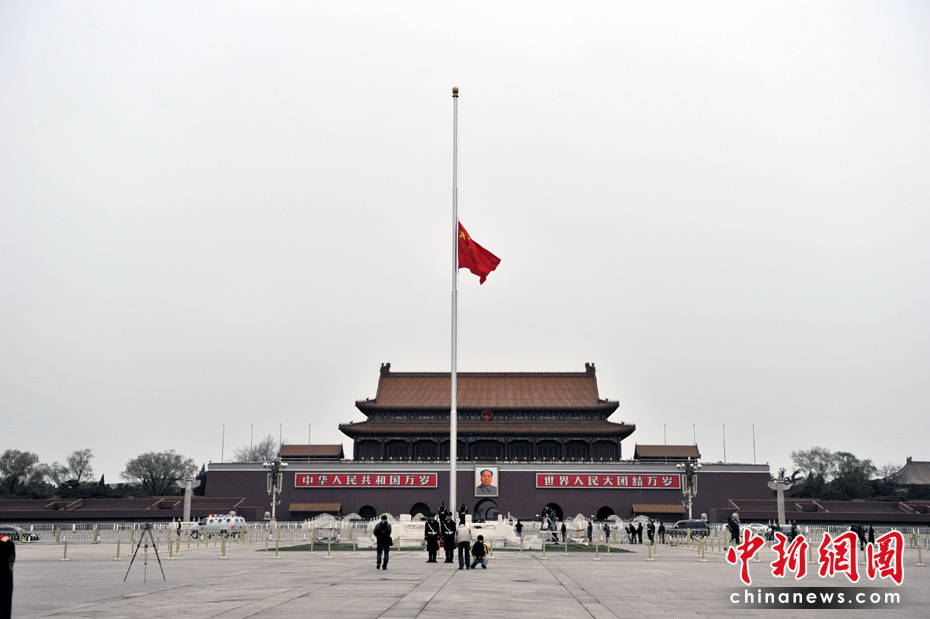4月21日早晨,北京天安門廣場(chǎng)下半旗向玉樹(shù)地震遇難者致哀。中新網(wǎng)記者 金碩 攝