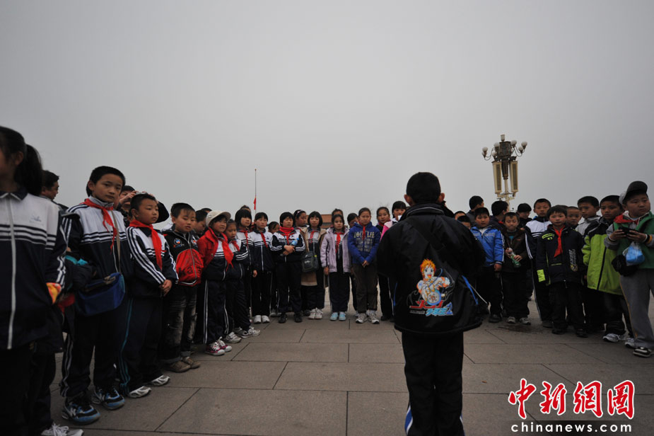 4月21日清晨,廊坊第十二小學(xué)的小學(xué)生來到天安門廣場朗讀自己的作文悼念青海玉樹地震的遇難同胞。中新網(wǎng)記者 金碩 攝