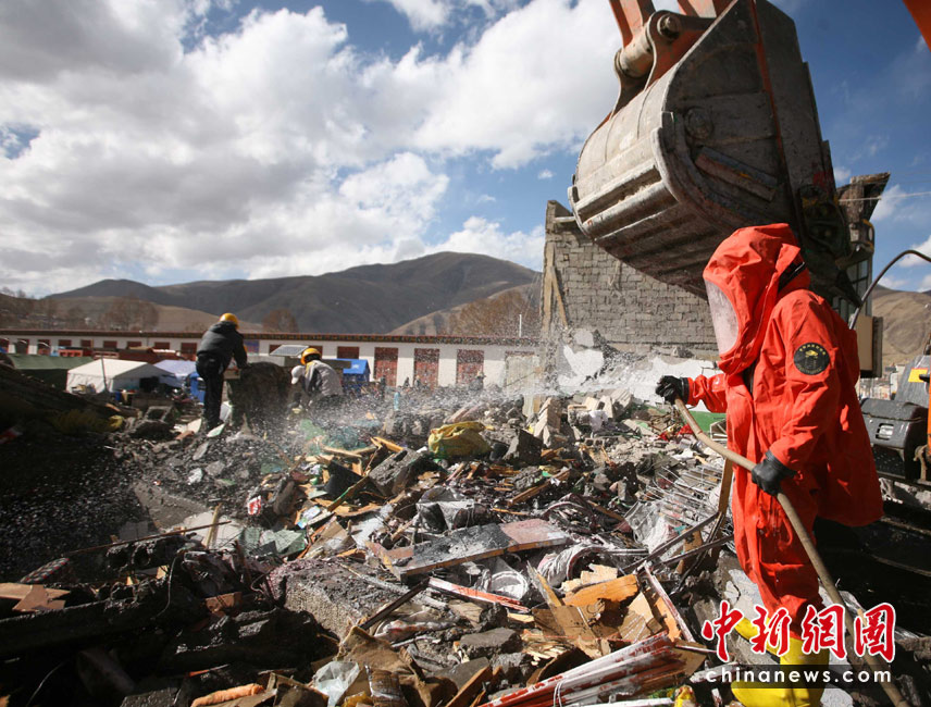 4月20日,來(lái)自四川內(nèi)江軍分區(qū)陸軍預(yù)備役防化團(tuán)開(kāi)始對(duì)玉樹(shù)城區(qū)廢墟展開(kāi)消毒工作。地震發(fā)生以后衛(wèi)生部門(mén)加強(qiáng)對(duì)震區(qū)消毒防疫工作力度,防疫人員開(kāi)始對(duì)廢墟、災(zāi)民安置區(qū)展開(kāi)拉網(wǎng)式消毒防疫,重點(diǎn)預(yù)防鼠疫、水質(zhì)污染,確保大災(zāi)之后無(wú)大疫。中新社發(fā) 劉忠俊 攝