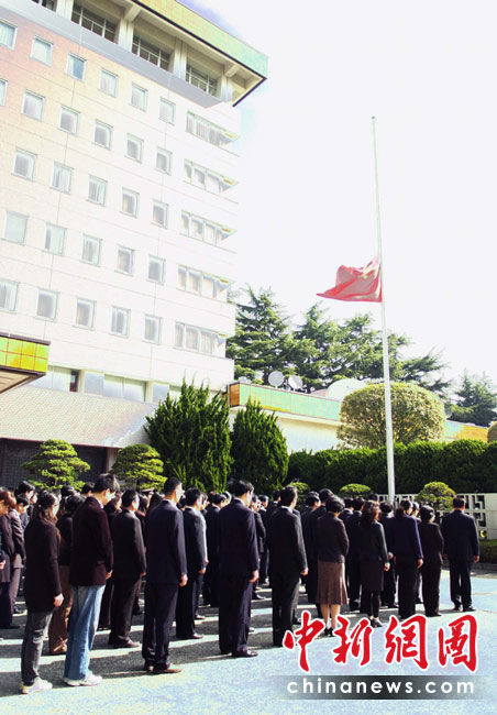 4月21日,按照中國國務(wù)院決定,舉行全國哀悼活動(dòng),全國和駐外使領(lǐng)館下半旗志哀,停止公共娛樂活動(dòng)。圖為中國駐日本大使館集結(jié)全館館員,進(jìn)行降半旗默哀紀(jì)念活動(dòng)。中新社發(fā) 孫冉 攝