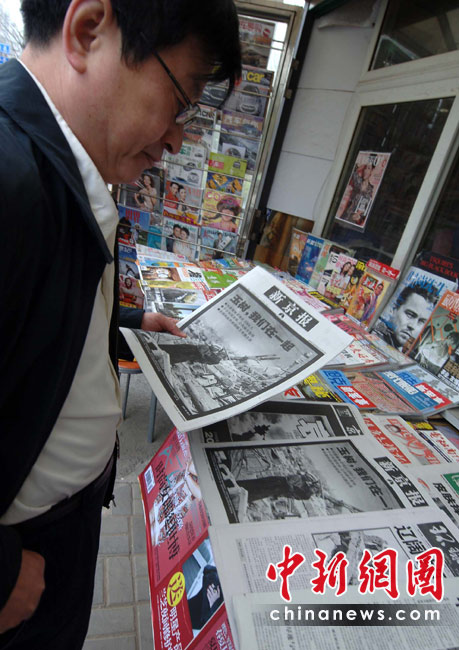 4月21日,按照中國國務(wù)院決定,舉行全國哀悼活動,全國和駐外使領(lǐng)館下半旗志哀,停止公共娛樂活動。當日北京各家報社刊出悼念玉樹地震遇難同胞特刊,并撤銷了一切彩色圖片和字頭,采用黑白版面。中新社發(fā) 鄒憲 攝