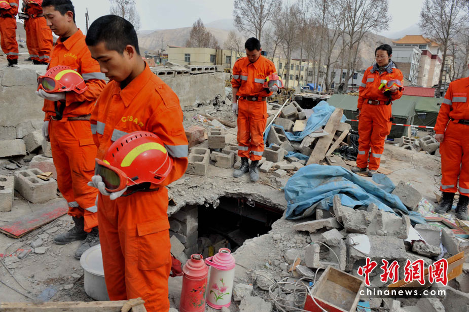 4月21日10時,中國國家救援隊在青海玉樹地震災(zāi)區(qū)搜尋廢墟上默哀,深切哀悼地震遇難同胞。中新社發(fā) 賈國榮 攝